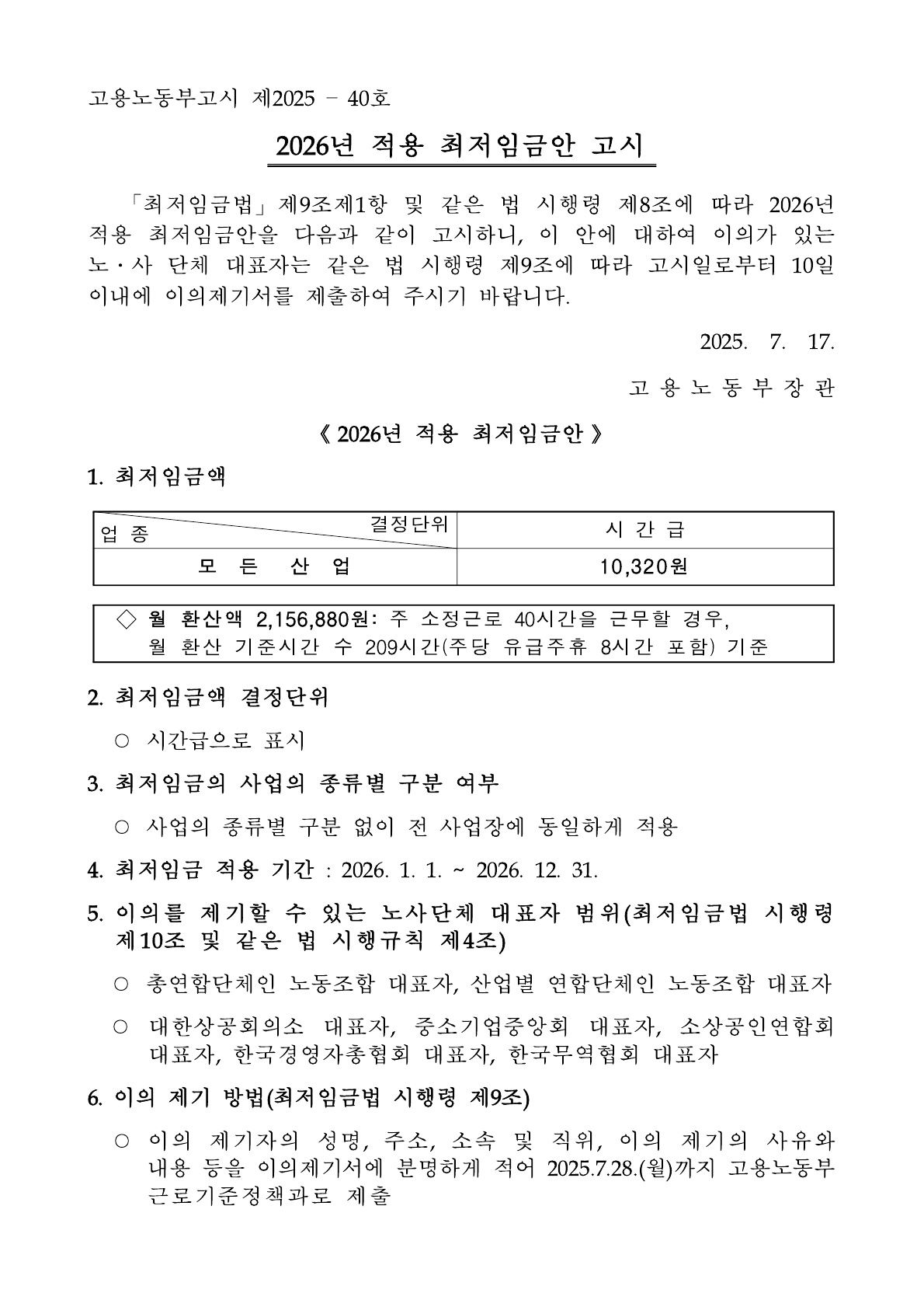 [고용노동부고시] 2026년 적용 최저임금안 고시
